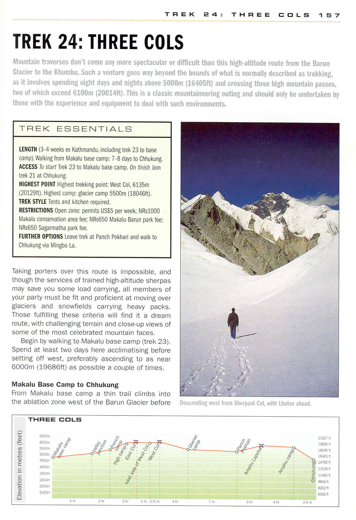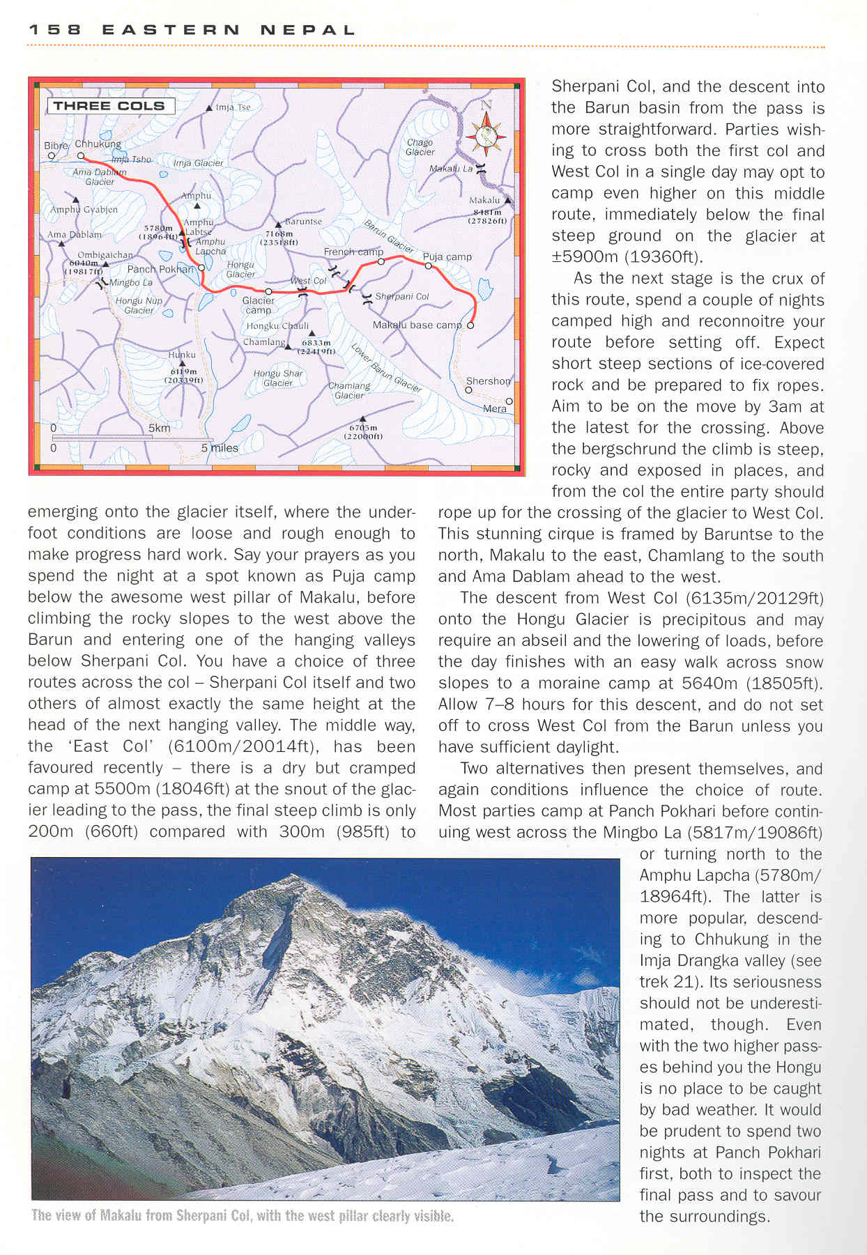 Beschrijving Steve Razzetti, Trekking and Climbing in Nepal. Trek 24, Three Cols, p.157 and p.158