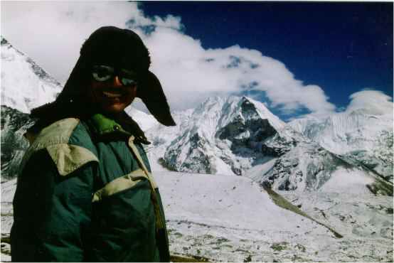 Climbing Sherpa Lama in front of Island Peak (6180 m) , our target. October/November, 1997. Use "Back" to return to photo index.
