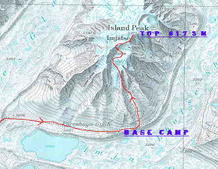 Island Peak detailed map with path to the top (6173 m) and location of base camp (5100 m).
