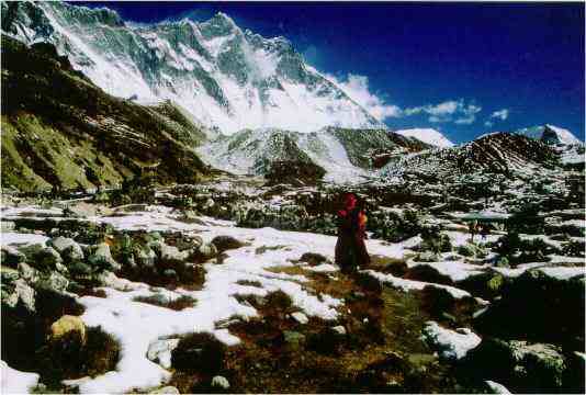 Monk on his way home near Chukung. He lives high up in the mountains at 4800 m altitude to be close with the Boedha. October/November, 1997. Use "Back" to return to photo index.