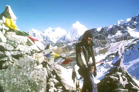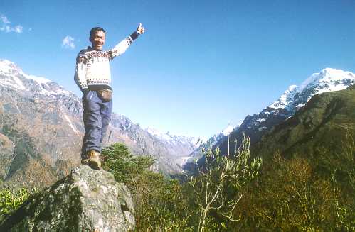 Phurba Sherpa at 3800 m altitude, with Ghunsa - Kambachen valley in the background. |
