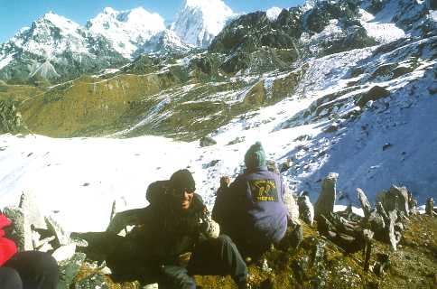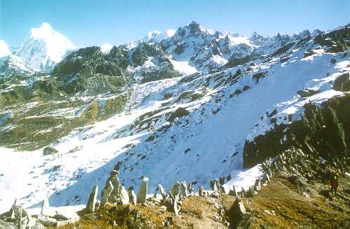 Sinion La Pass (4440 m altitude), between Ghunsa and Tseram. With upright prayer stones. |