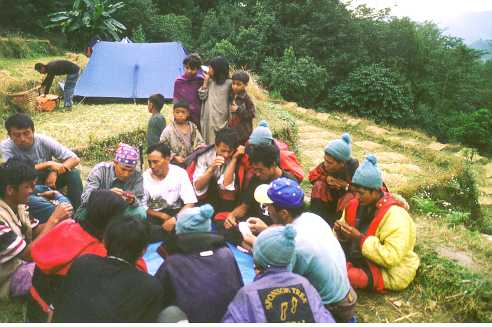 Camp and playing cards in rice field camp near Kunjari (1928 m altitude). |