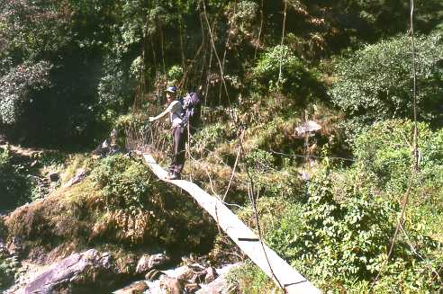 Old, swinging bridge with Phurba Sherpa. Bit unsafe, only used during the monsoon. |
