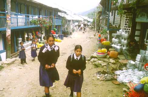 Shopping street in Taplejung, a district capital in North-Eastern Nepal, with school girls. |