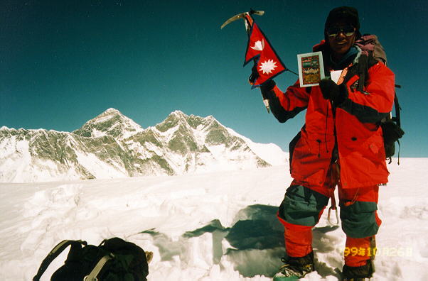 Klimgids Nima Tamang met de vlag van Nepal op de top van de Ama Dablam met de vlag van Nepal en een Boedhistisch plaatje.
