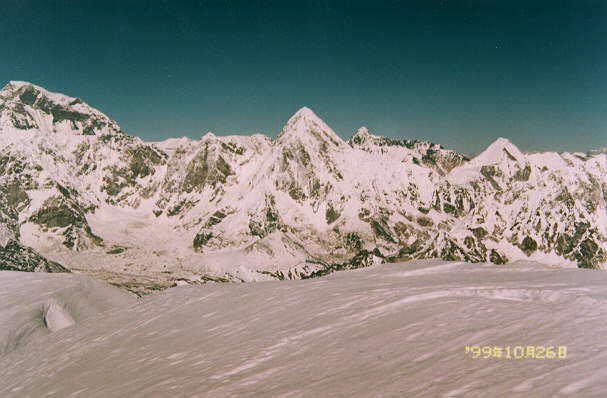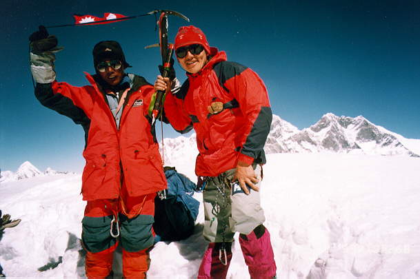 Achtergrond Everest (pyramide, 8838 m (recente hoogtemeeting 1999), Lhotse (rechts, 8501 m)) en Nuptse (links, 7861 m)