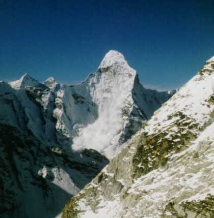 Lawine aan de Noord zijde van de Ama Dablam (6828 m). Foto genomen vanaf Island Peak op 5900 m hoogte.