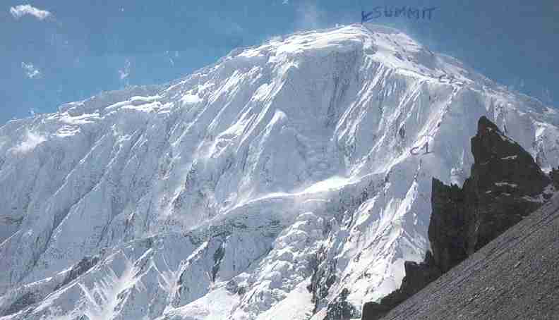 Tilicho Peak met Camp 1 en 2 aangegeven. Base camp aan de voet van de berg rechts onder. Foto beschikbaar gesteld door Rudy Maier, leider van de Oostenrijkse beklimming tijdens april en mei 2001