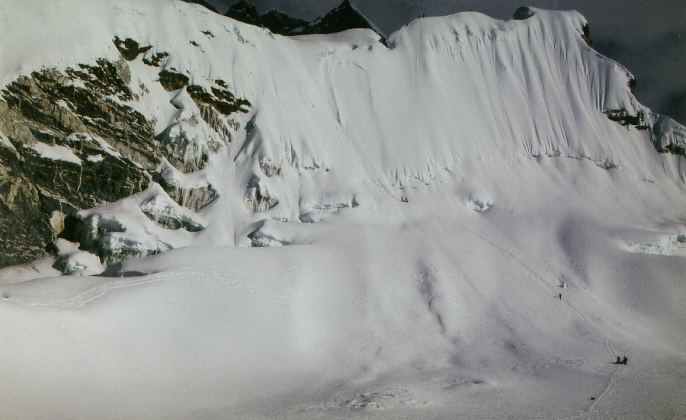 Glacier and ice wall at 6000 m altitude near top Island Peak (6180 m altitude). October/November, 1997. Use "Back" to return to photo index.