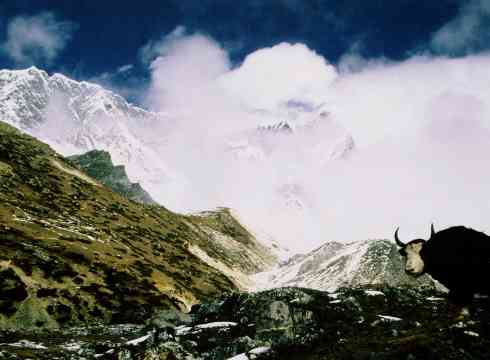 Yak at Chukung (4700 m altitude) with Lotze (8500 m) in the back-ground in the clouds.